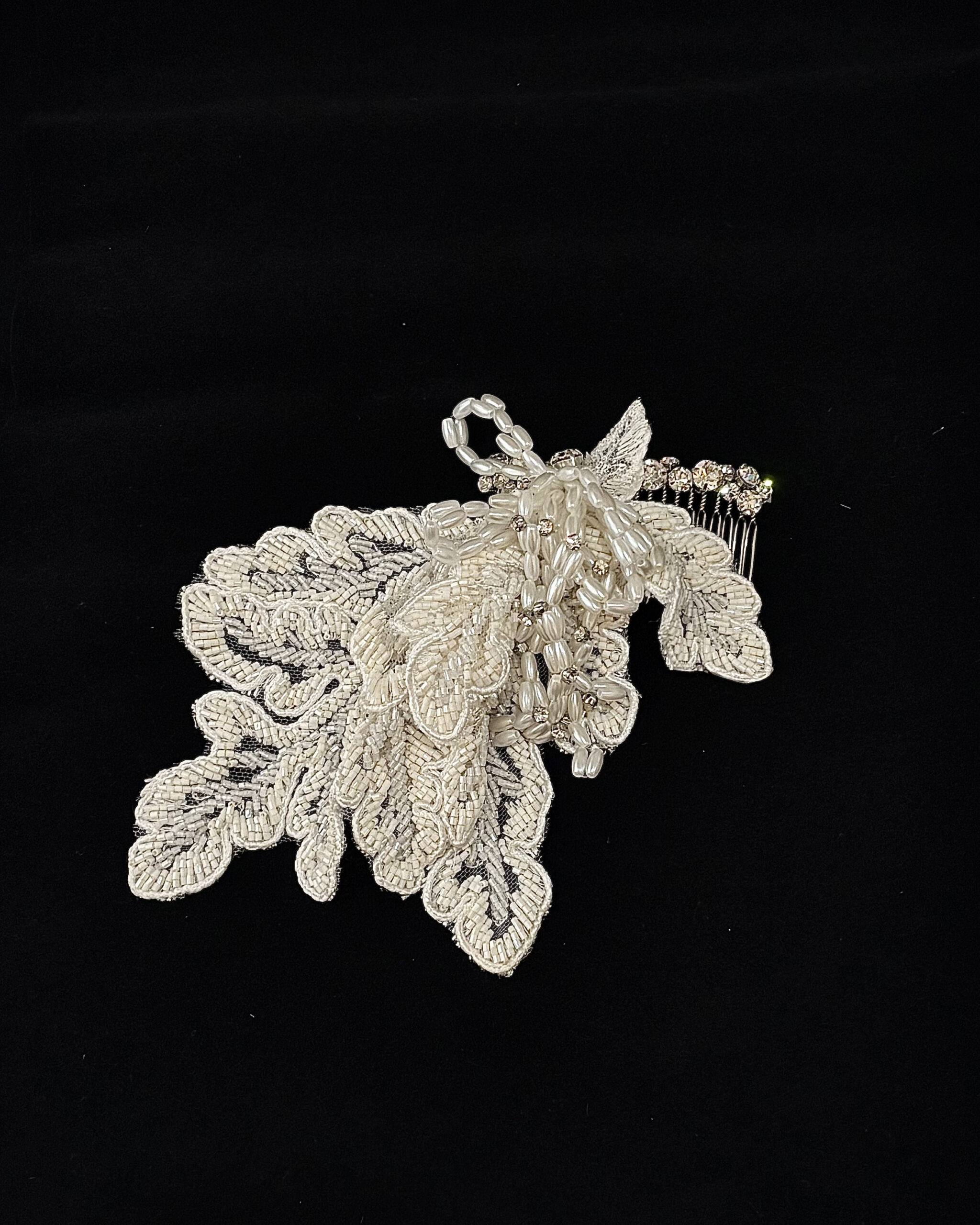 Vintage-inspired beaded lace hair comb add a touch of timeless romance to your bridal look. This exquisite hand-detailed hairpiece features delicate lace appliqués, shimmering seed beads, and polished pearl accents.