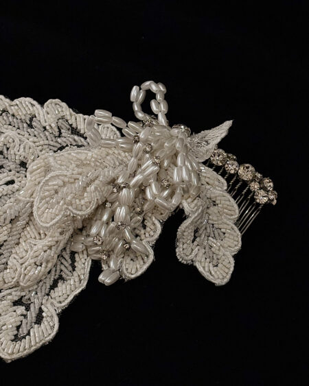 Vintage-inspired beaded lace hair comb add a touch of timeless romance to your bridal look. This exquisite hand-detailed hairpiece features delicate lace appliqués, shimmering seed beads, and polished pearl accents.